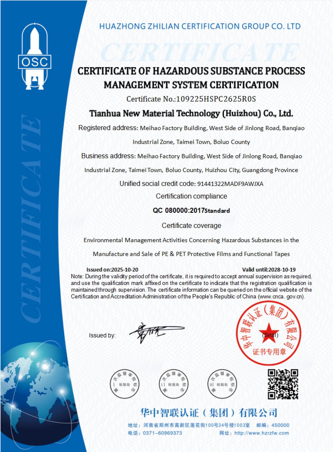 下一篇:惠州天华-有害物质过程管理体系认证证书